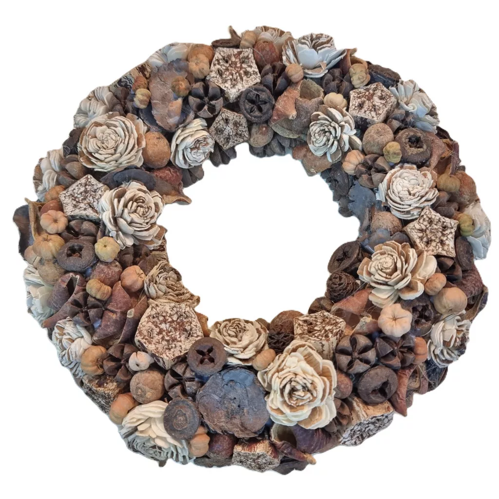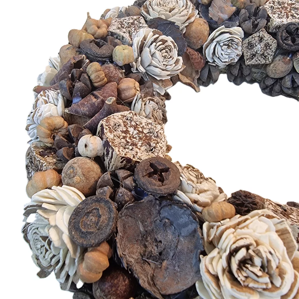 A meleg, természetes barna és bézs árnyalatok harmonikus összhatást nyújtanak, így a koszorú remek választás az év bármely időszakában, különösen az őszi-téli hónapokban.
