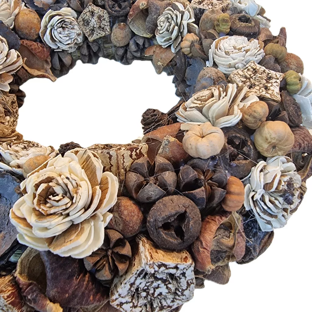 Ez a természetes alapanyagokból készült, kézzel összeállított koszorú egyedi, rusztikus hangulatot áraszt. A kompozíció kizárólag natúr termésekből és szárított növényi részekből áll – különféle magtokok, terméshüvelyek és érdekes felületű növényi elemek alkotják a gazdagon díszített felületet.