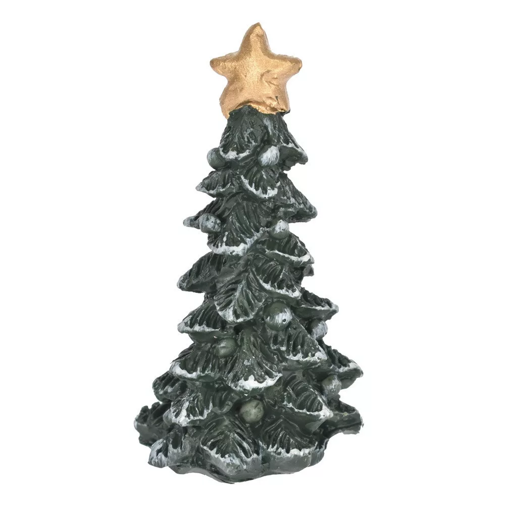 A fenyőfa csillaggal polyresin zöld 4,8 cm a karácsony szimbólumát hozza el miniatűr, részletgazdag formában. A finoman kidolgozott zöld fenyő hófödte ágai és az aranyló csillag klasszikus ünnepi látványt nyújtanak.