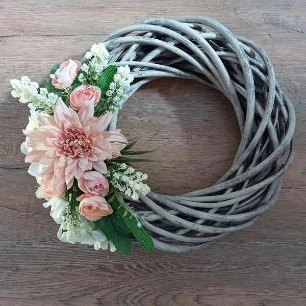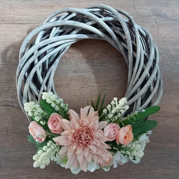 Fonott koszorú fehér és barack színű virágokkal