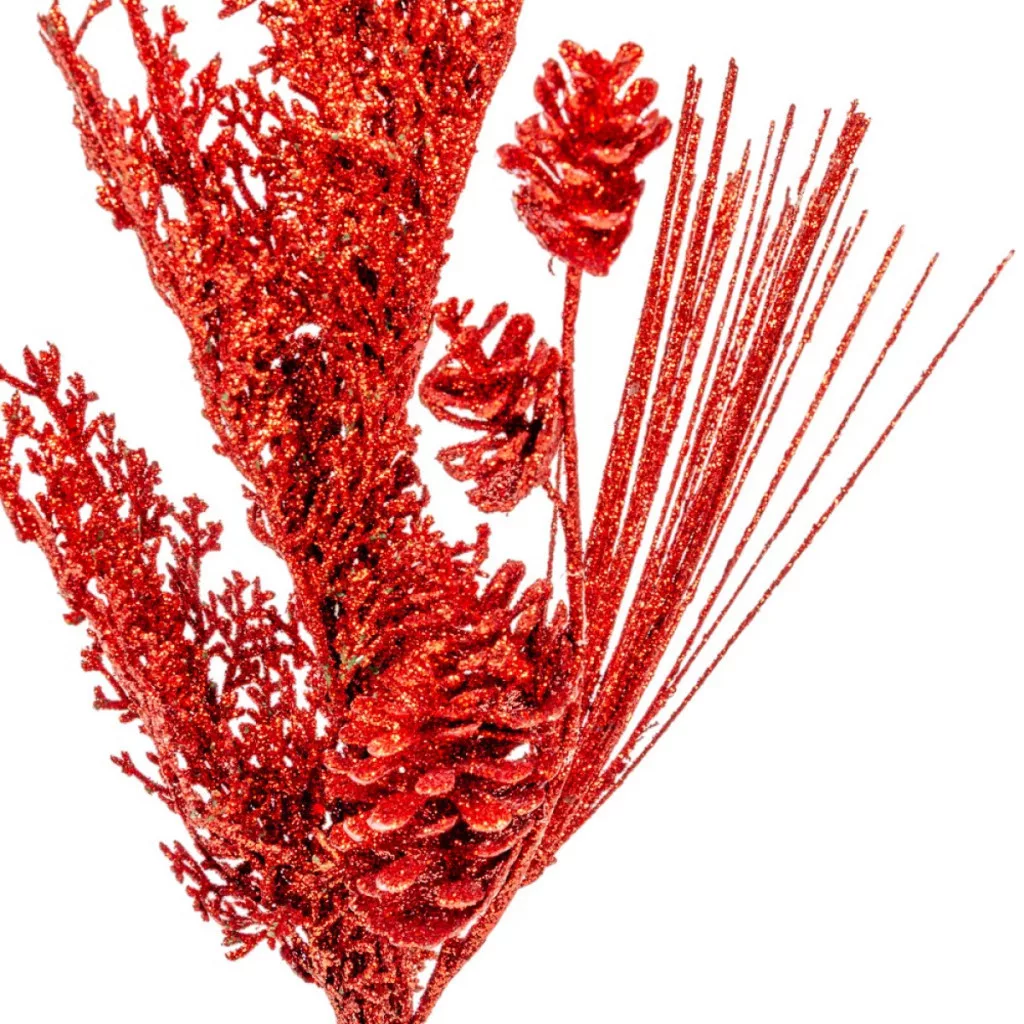 Ez a 68 cm hosszú, csillogó piros dekorág a karácsony egyik legikonikusabb dísze lehet. Részletgazdag ágrészei, aprólékosan kidolgozott tobozai és finoman szórt glitter bevonata igazán ünnepi megjelenést kölcsönöznek. Tartós, hajlítható szára lehetővé teszi, hogy könnyedén illeszd koszorúba, vázába vagy asztaldíszbe. Piros árnyalata melegséget és életet visz minden kompozícióba, miközben a csillogás elegáns, prémium hatást kelt. Tökéletes választás azok számára, akik szeretik a hagyományos karácsonyi színeket modern, stílusos megjelenésben.