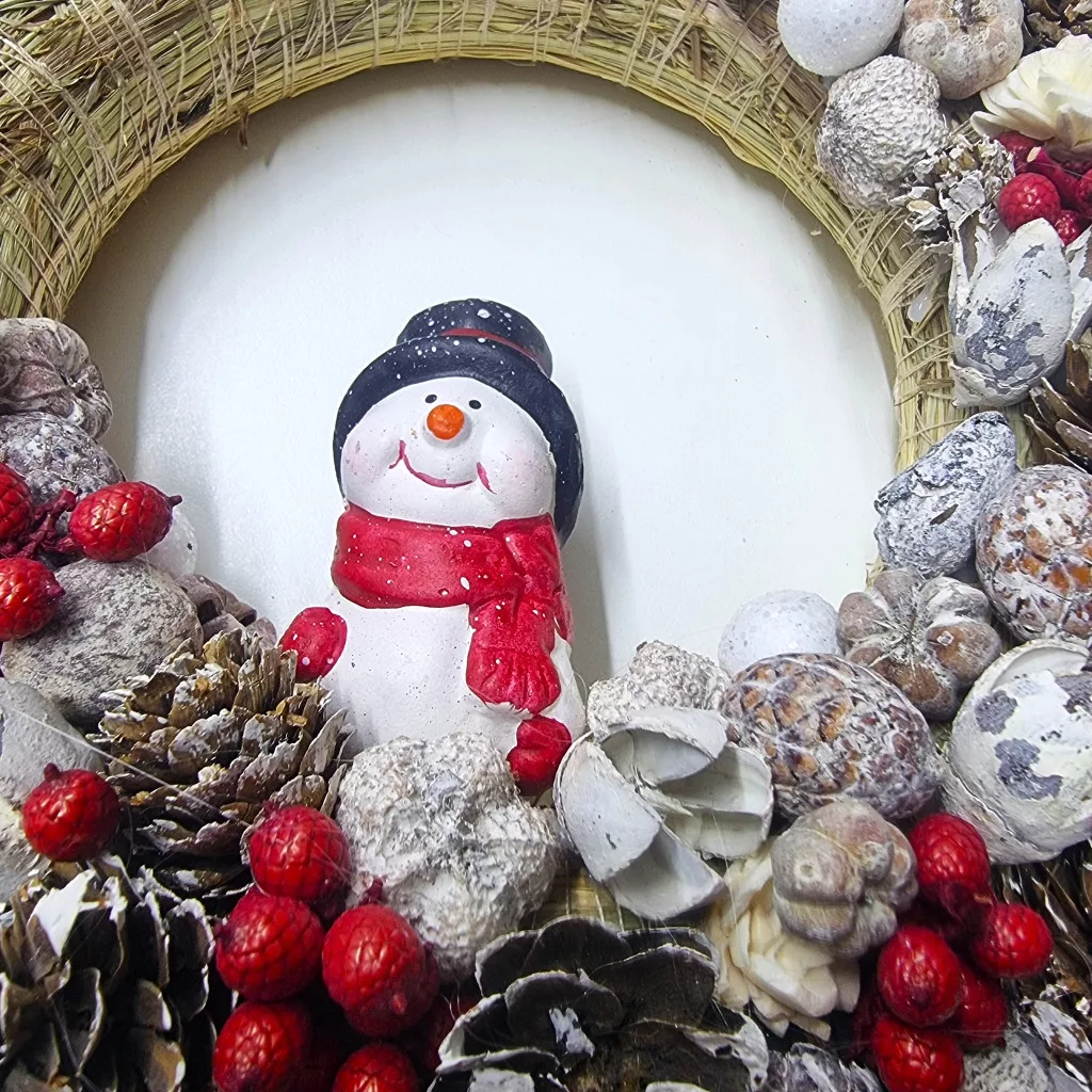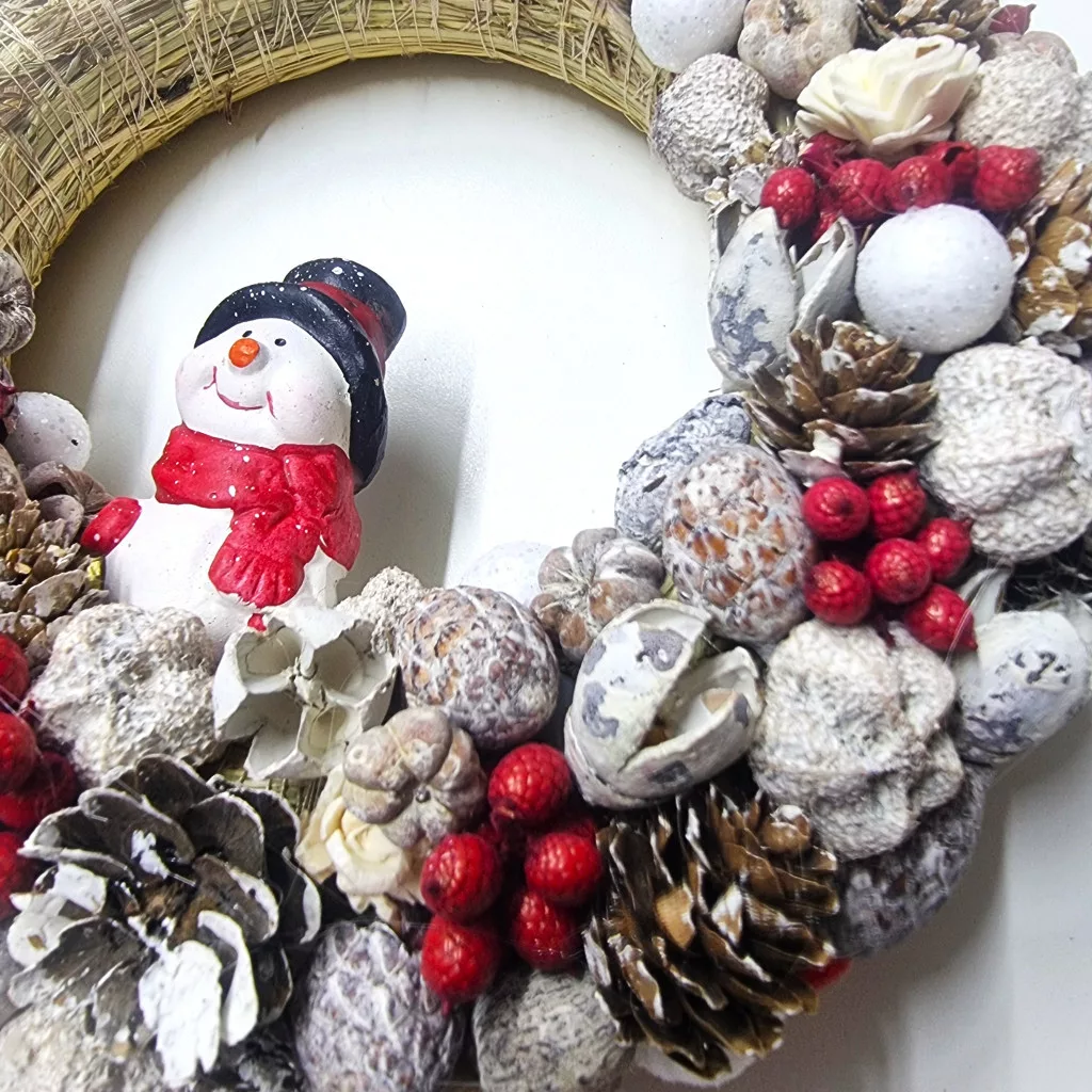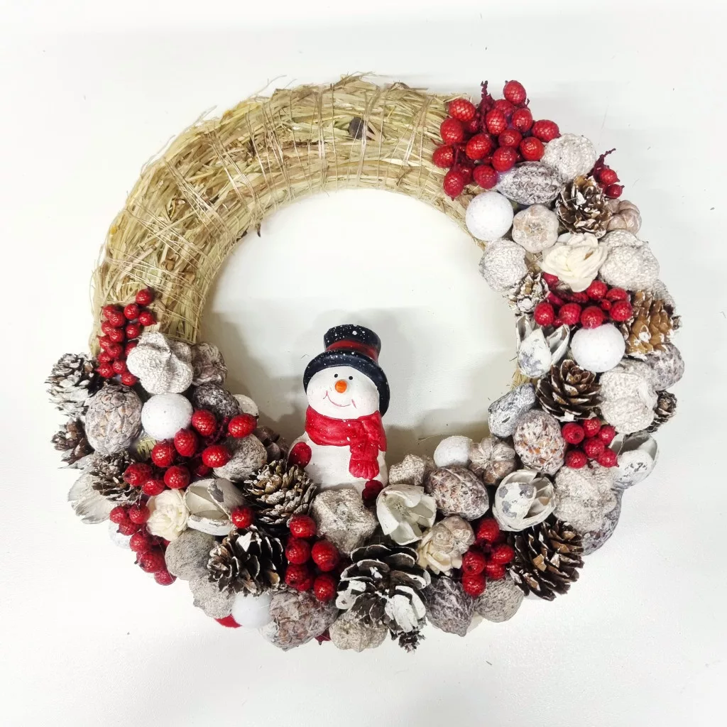 A természetes szalmaalap, a tobozok, bogyók és hófehér díszek együtt a tiszta téli nyugalmat idézik.