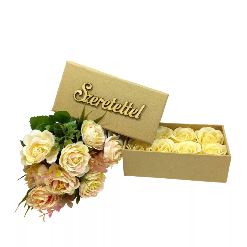 Illatos szappanrózsa natúr hosszúkás alakú dobozban natúr Szeretettel felirattal krém rózsákkal
