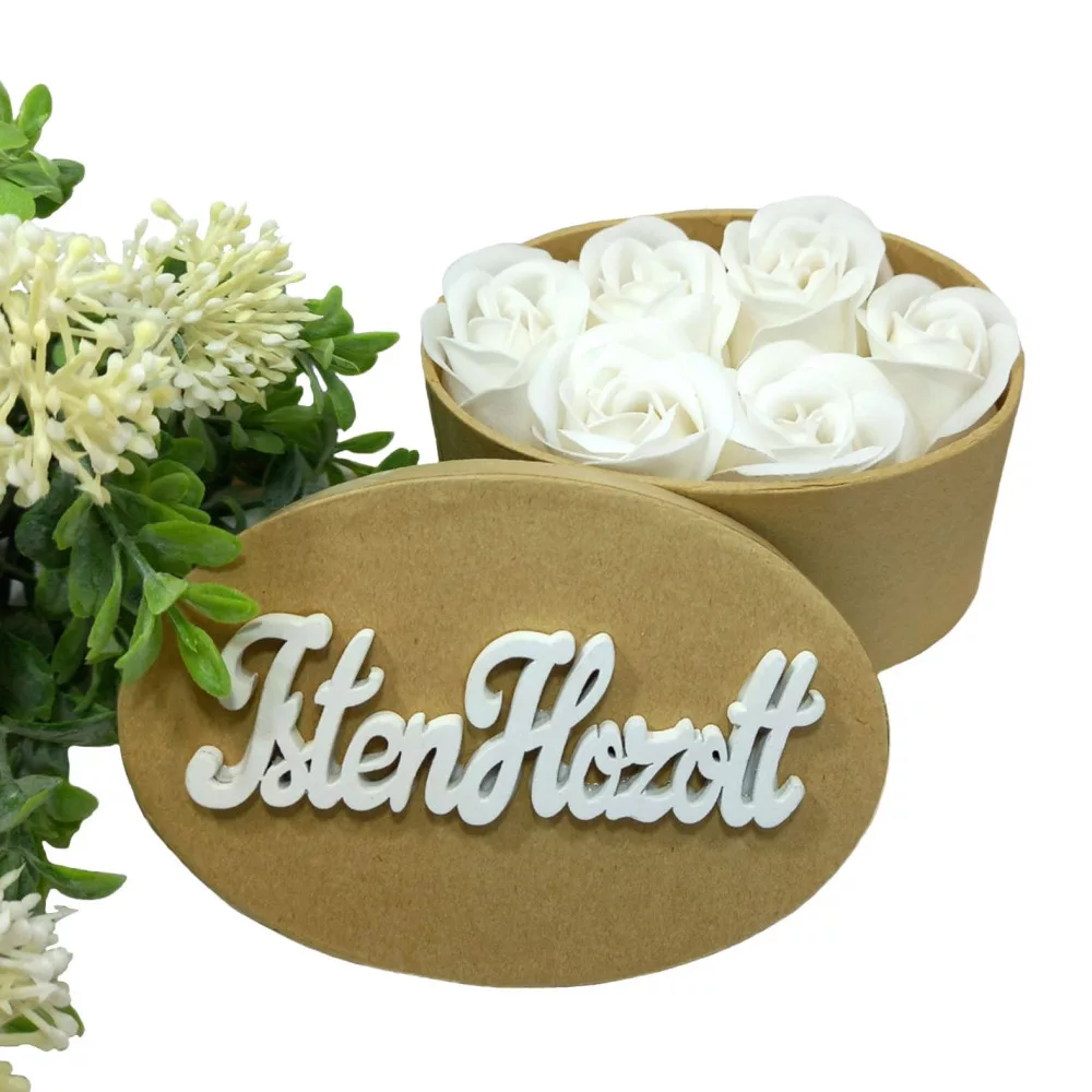 Illatos szappanrózsa natúr ovális dobozban fehér "Isten Hozott" felirattal fehér rózsákkal