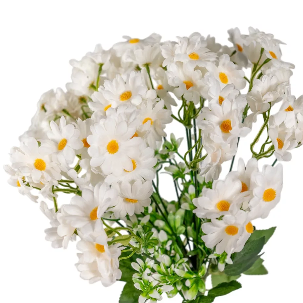 A fehér margaréta a hűség és a tisztaság jelképe, amely minden dekorációban a könnyedséget képviseli. A csokor kialakítása lehetővé teszi, hogy egyben használd vázadíszként, vagy ágakra bontva több kisebb kompozíciót készíts belőle.