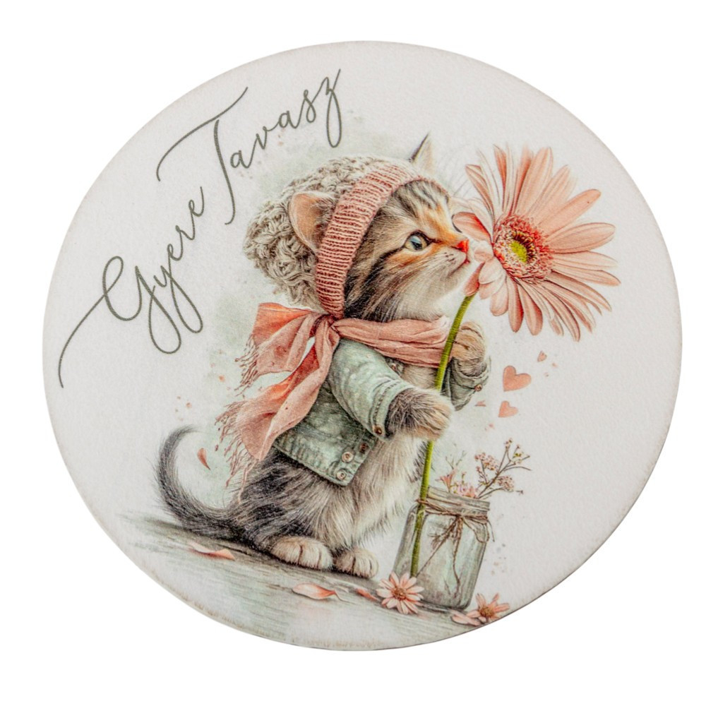 Üdvözöld a kikeletet ezzel a szívmelengető, 14,8 cm-es nyomtatott fa táblával! A tábla központi motívuma egy tüneményes kiscica, aki éppen egy rózsaszín virág illatát élvezi – ez a jelenet tökéletesen ragadja meg a tavasz ébredésének varázsát. A „Gyere Tavasz” felirat pedig még inkább fokozza az ünnepi, várakozással teli hangulatot.