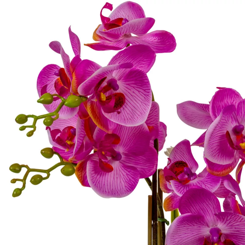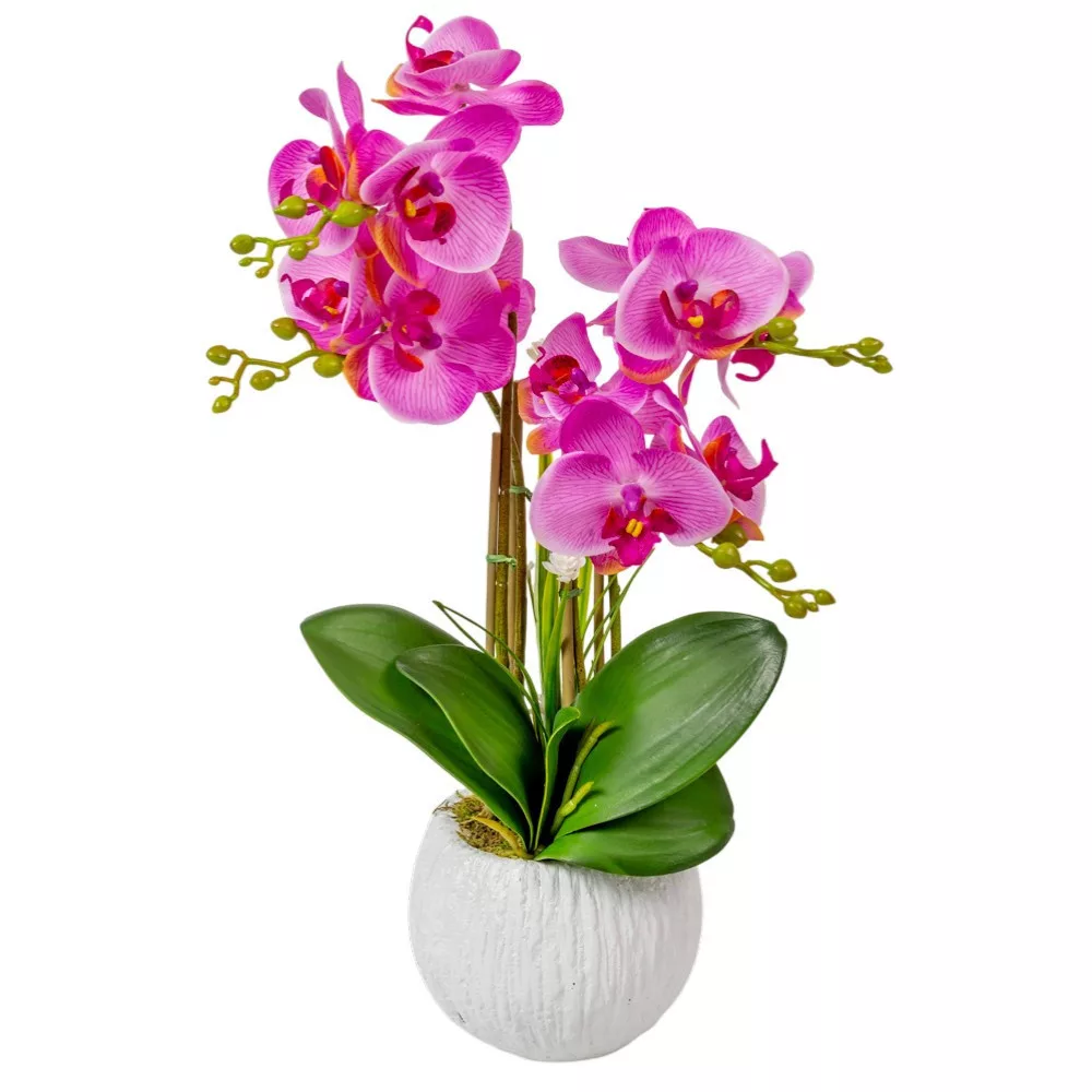 Érdemes ezt a 4 ágú, lila orchideát választanod, ha vágysz az egzotikus virágok szépségére, de nem szeretnél a kényes gondozásukkal bajlódni. A speciális "real touch" gumi anyagú szirmok nemcsak látványra, hanem tapintásra is élethűek, ráadásul rendkívül tartósak és könnyen tisztíthatók. A 50 cm-es magasság és a dús virágzat garancia arra, hogy ez a növény a nappalid vagy a recepciónk központi dísze lesz. Mivel nem igényel fényt vagy öntözést, olyan helyeken is (például sötétebb folyosókon vagy fürdőszobákban) élvezheted a virágzó orchidea látványát, ahol az élő változatok elpusztulnának. Ez a dekoráció befektetés a stílusba: egyszeri vásárlással hosszú éveken át tartó, hervadásmentes eleganciát kapsz.