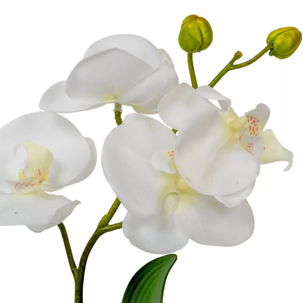 A kompozíció felépítése a természet dinamikáját követi: a hajlékony, sötét száron több teljesen kinyílt virágfej mellett zárt, élethű zöld bimbók is találhatók. Az orchidea tövénél elhelyezkedő dús, húsos zöld levelek stabil vizuális alapot és élettel teli kontrasztot nyújtanak a fehér virágoknak. Ez a cserepes orchidea tökéletes megoldás azoknak, akik vágynak az egzotikus virágok látványára, de nem tudják biztosítani a tartásukhoz szükséges speciális páratartalmat vagy fényt.