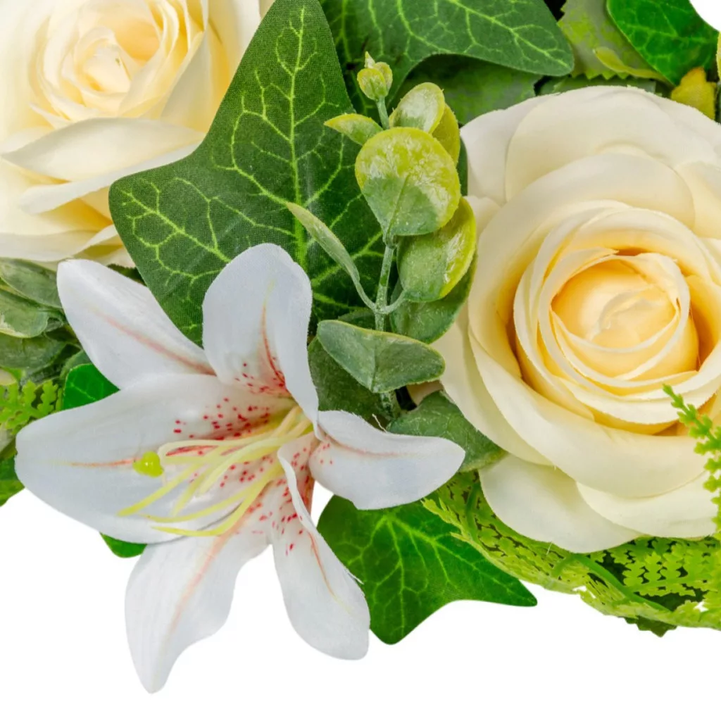 - Elegáns virágösszeállítás: Élethű, krém színű rózsa és liliom fejekkel gazdagon borítva.