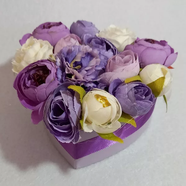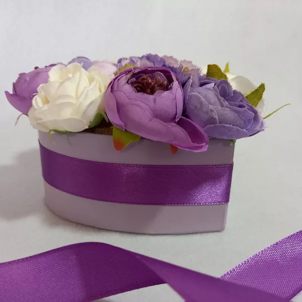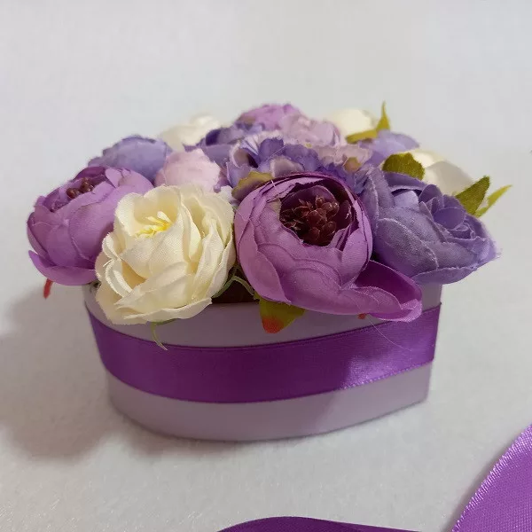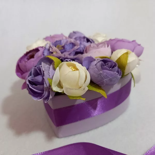 Selyemvirág box - Lila-ekrü szív alakú