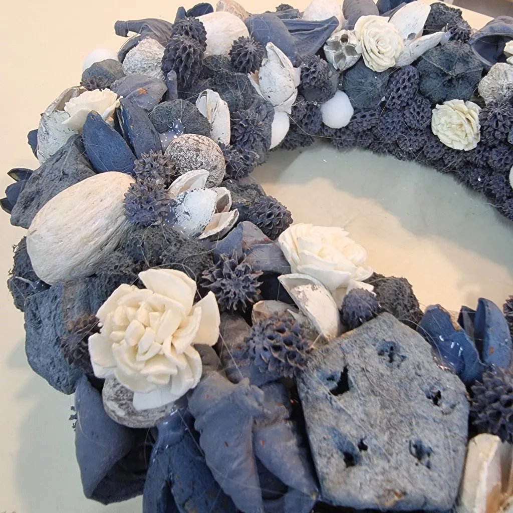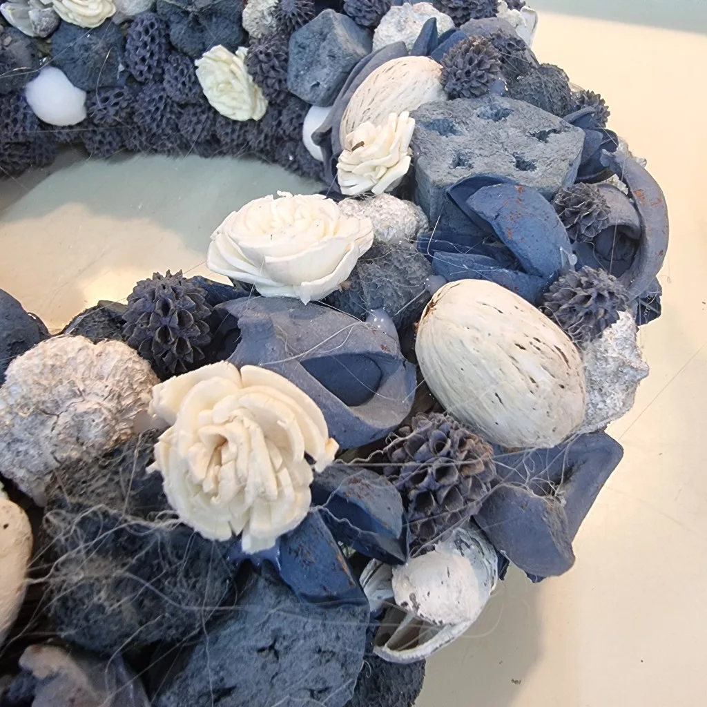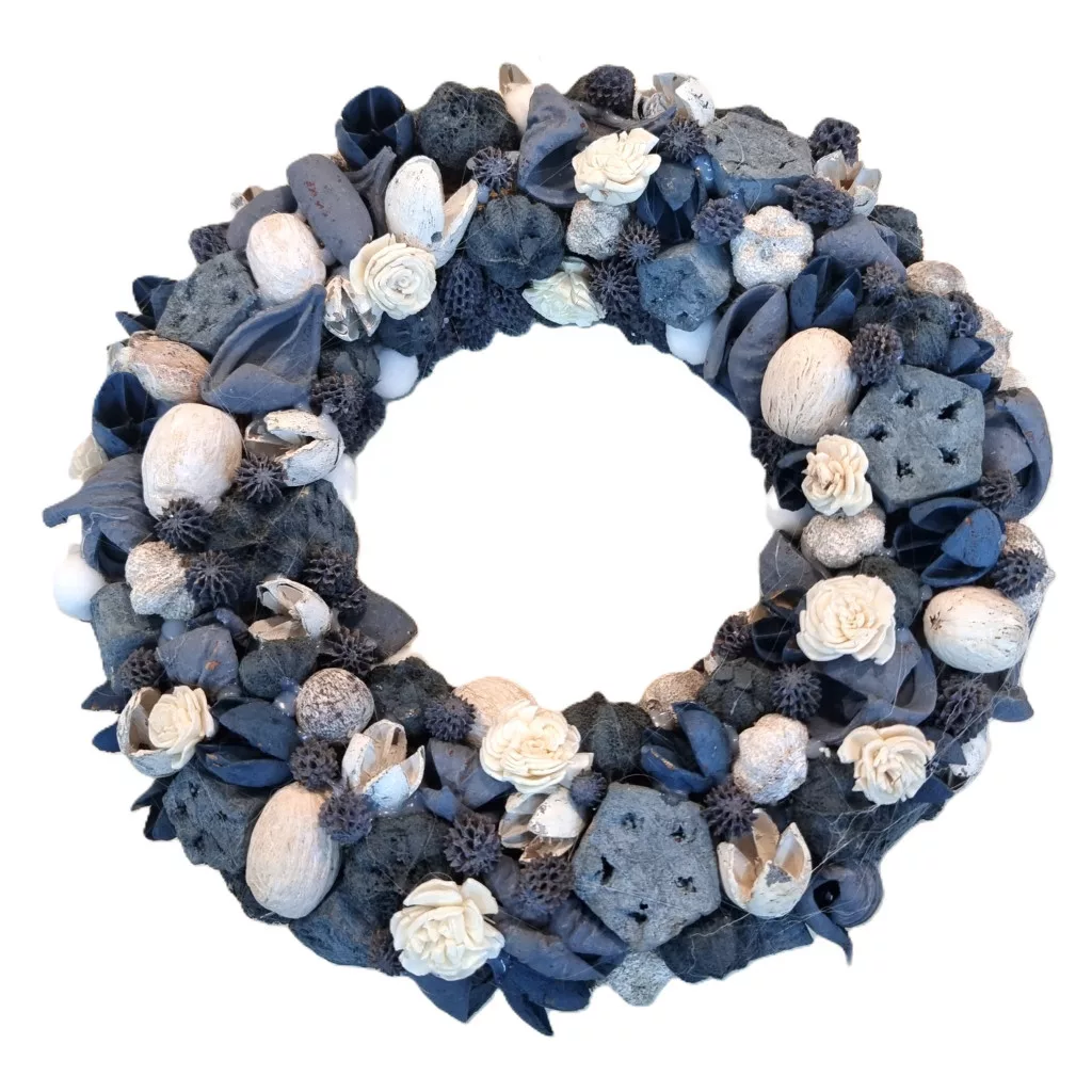 Különleges, sötétkék és fehér színekben pompázó kézműves koszorú, amely stílusos és időtálló dísze lehet otthonodnak. A természetes száraztermések, virágmotívumok és kézzel festett részletek modern, elegáns hangulatot keltenek. Ajtóra, falra vagy akár asztaldíszként is remek választás.