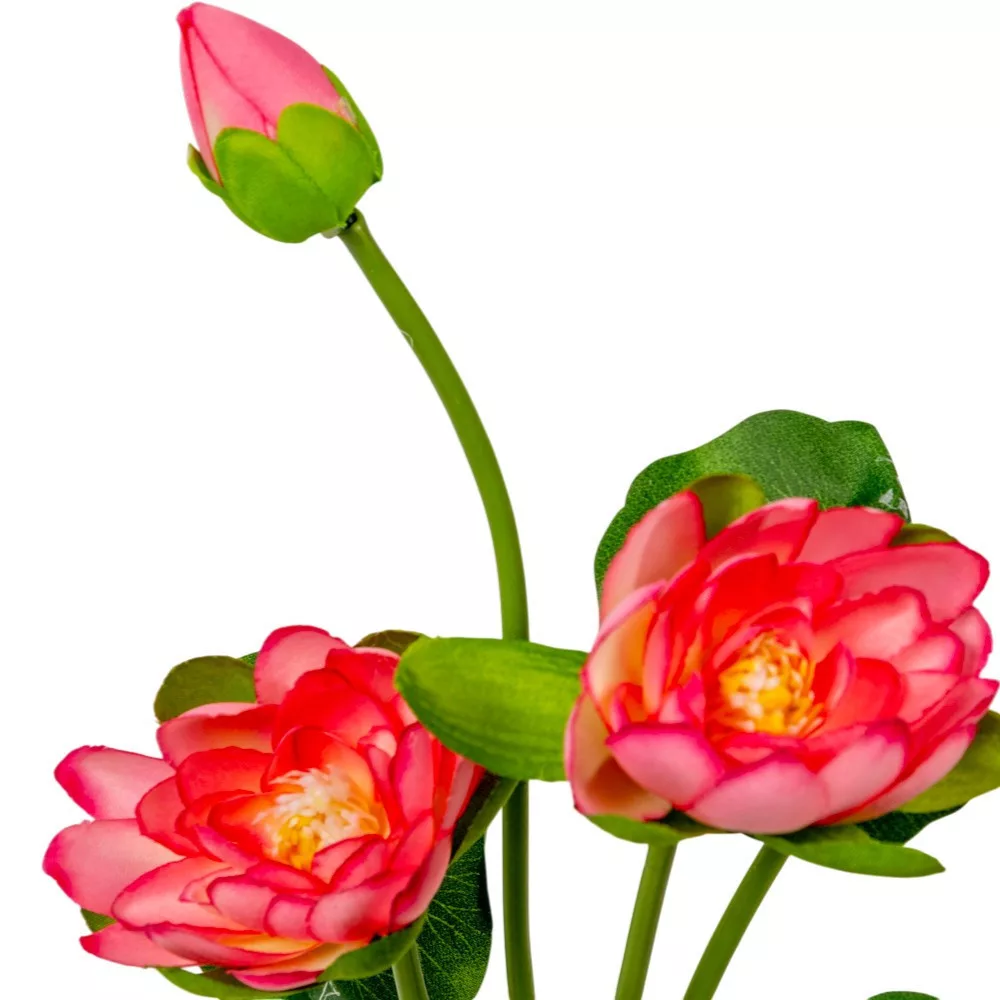 A rózsaszín tavirózsa az érzelmek és a harmónia szimbóluma, amely ezzel a mesterséges, mégis élethű csokorral az év minden napján díszítheti környezetét. A 37 cm-es magasság lehetővé teszi, hogy kisebb és közepes vázák központi dísze legyen, de a szálak alakíthatósága miatt komplexebb kompozíciókba is könnyen beilleszthető. A csokor különlegessége a zárt bimbó jelenléte, amely természetes dinamikát és élettel teli hatást kölcsönöz a megjelenésének.