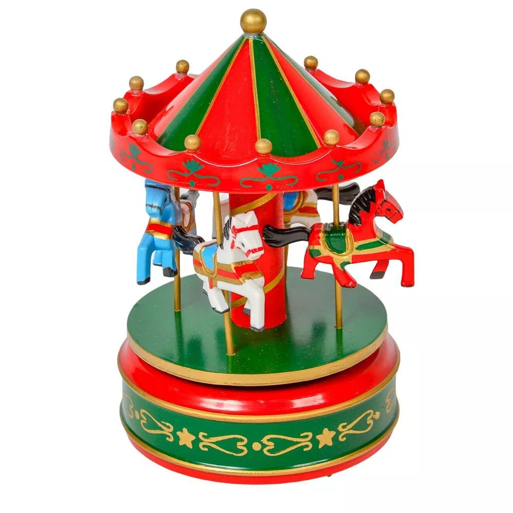 Ez a gyönyörűen kidolgozott, kézzel festett fa körhinta a karácsonyi dekoráció egyik legkedveltebb darabja. A piros-zöld-arany színek klasszikus ünnepi hangulatot idéznek, a finoman mozgó lovacskák és a dallam együtt pedig meghitt, mesés atmoszférát hoznak a szobába.