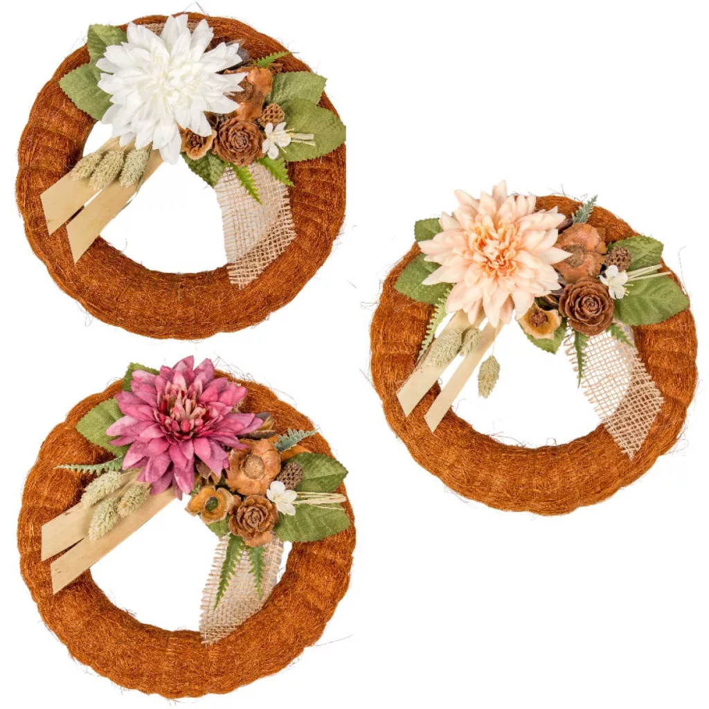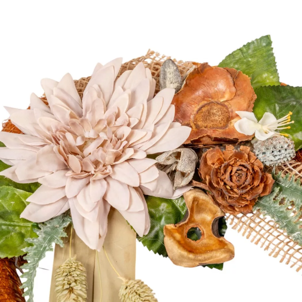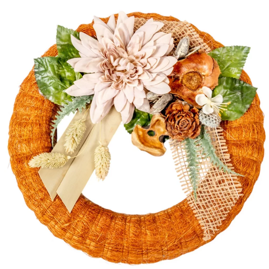 Szizálos széna koszorú selyem ésszárazvirág dízítéssel barna 25cm